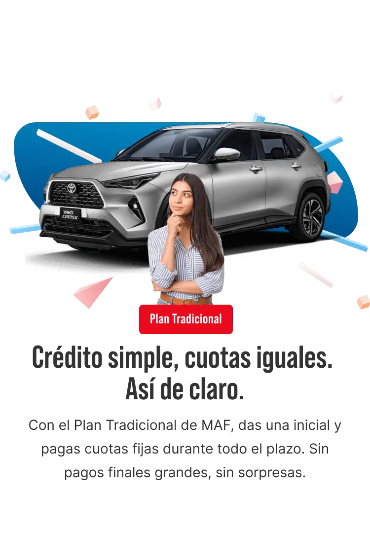 Plan TradicionalCuota inicial desde 10%Cuotas fijas durante todo el créditoPlazos desde 12 hasta 72 mesesMás información